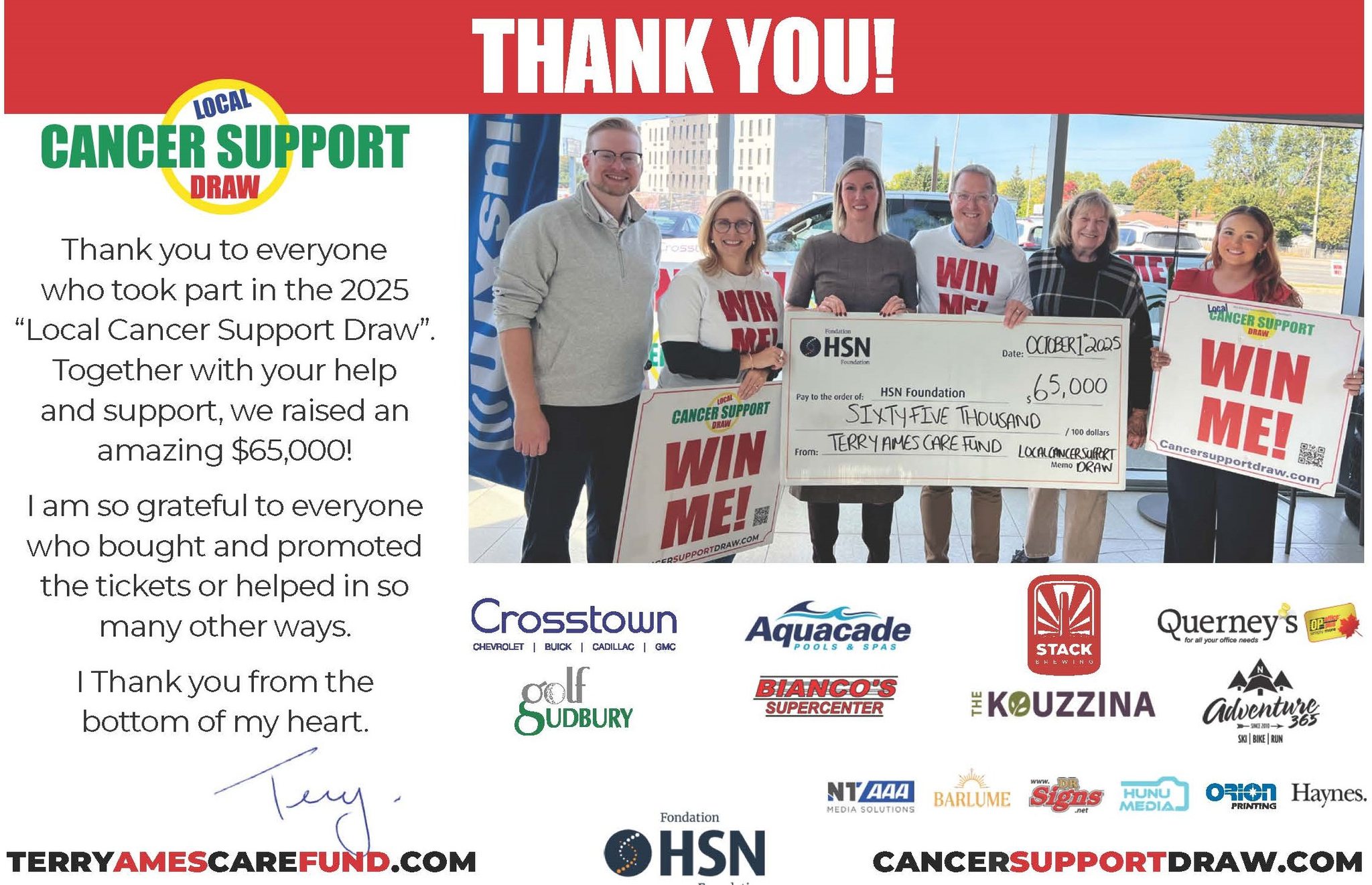 It is difficult to understand the financial pressures that a family faces when someone is diagnosed with cancer. Time off work, travel, parking, treatments and diagnostics that aren’t covered by OHIP, can all place a huge burden on family finances. The Terry Ames Care Fund at the HSN Foundation was set up to help Sudbury families who need financial help so that they could focus on beating cancer.